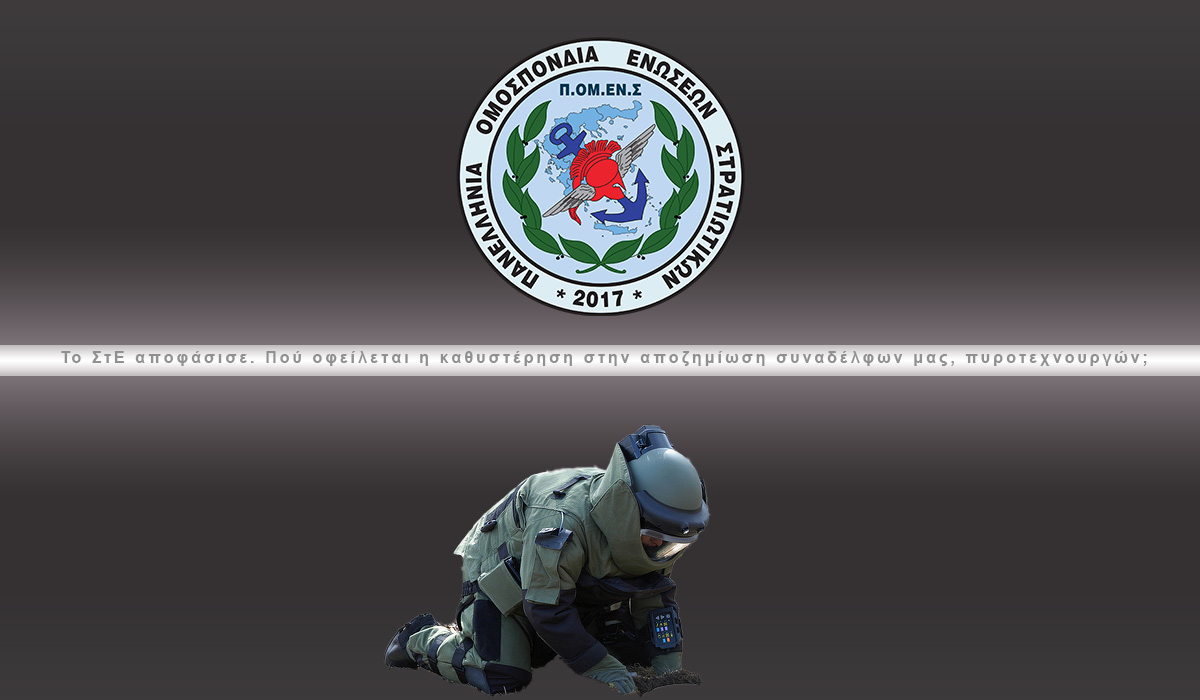 - Η Πανελλήνια Ομοσπονδία Ενώσεων Στρατιωτικών - Π.ΟΜ.ΕΝ.Σ., σε συνέχεια μακροχρόνιων παρεμβάσεών της από το 2018 (σχετ. α και γ), και κατόπιν του (ι) όμοιου εγγράφου της Ένωσης Στρατιωτικών Περιφέρειας Ηπείρου (Ε.Σ.ΠΕ.ΗΠ.), επαναφέρει με έμφαση και αγωνία το μείζον ζήτημα της κατάφωρης θεσμικής και οικονομικής αδικίας, η οποία εξακολουθεί να πλήττει τους Πυροτεχνουργούς του Στρατού Ξηράς, οι οποίοι επιτελούν εξαιρετικά επικίνδυνες αποστολές εξουδετέρωσης πυρομαχικών και εκρηκτικών μηχανισμών.