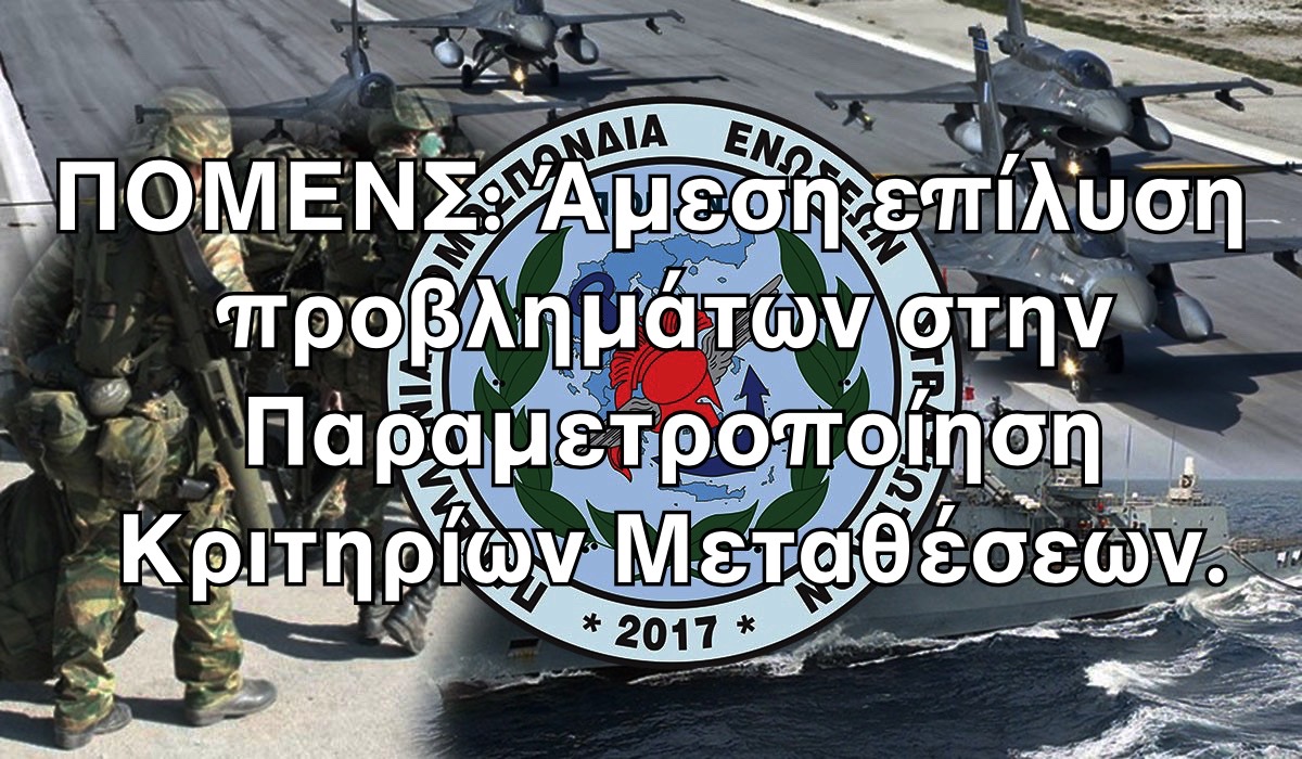 4. Η Πανελλήνια Ομοσπονδία Ενώσεων Στρατιωτικών - Π.ΟΜ.ΕΝ.Σ, με ανακοίνωσή της την 07 Δεκ 2021 https://www.pomens.gr/enimerosi/deltia-typou/1719-pomens-parametropoiisi-kritirion-metatheseon-i-dikaiosi-kai-oi-paremvaseis-epilysis-ton-strevloseon εξέφρασε την ικανοποίησή της στη Πολιτική και Στρατιωτική Ηγεσία του Υπουργείου Εθνικής Άμυνας που προέβη στην επικαιροποίηση της Υπουργικής Απόφασης διορθώνοντας αρκετές στρεβλώσεις που υπήρχαν, αφήνοντας όμως και αρκετές εκκρεμότητες για τις οποίες η Ομοσπονδία θα επανέλθει συγκεντρωτικά με προτάσεις της.